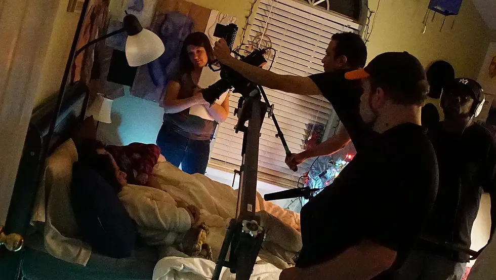 One of the other aspects that scared me about the project was the VFX. I had never done anything with VFX before and I didn’t want the film to look cheesy with bad computer FX. The hallucination effects had to land, perfectly. Luckily, I was connected to a local filmmaker Sharad Patel - who is far more talented than anyone I know. He can teach himself anything, and he truly has an artistic eye. He could do the cinematography and the VFX and he became my collaborator and partner in this project. We crafted every image together through discussion before we shot. It took us a week to storyboard together off my terrible storyboards and with that we had a visual road map of the entire movie. We did test shoots. I wanted to make sure we had time to do this right so we took a 19 page script and shot every angle of coverage you can imagine over 6 days. We had a large concert scene with a trick shot in the middle and a bunch of extras that we had to make look like 100. I wanted to make sure we had options in post. With a background in documentary, I tend to have a higher shooting ratio so I can craft my story in the edit. It was a challenging production that I was excited and terrified for, but I had amazing people to lean on, especially my Assistant Director, Eddie Rodriguez who led the team.